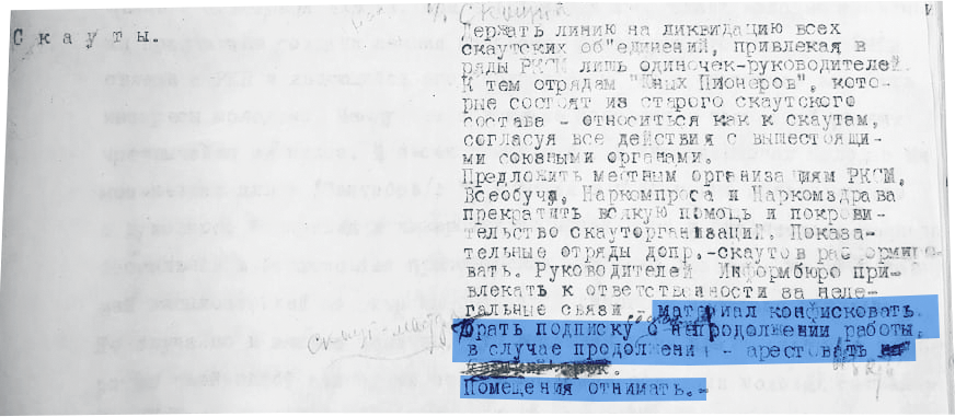 Про скаутов сказано так: «Держать линию на ликвидацию. Отряды расформировать. Помещения отнимать».