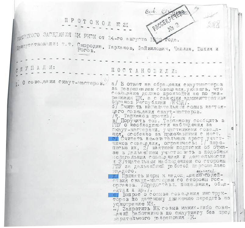 В 1922 году комсомол начал репрессии против скаутов. Вот выдержка из постановления бюро ЦК комсомола «О тактике по отношению к антисоветским группировкам среди молодежи» от 17 июня 1922 года.